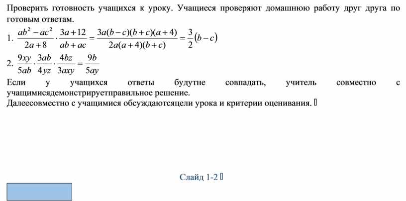 Повторить выполнение умножения алгебраических дробей |