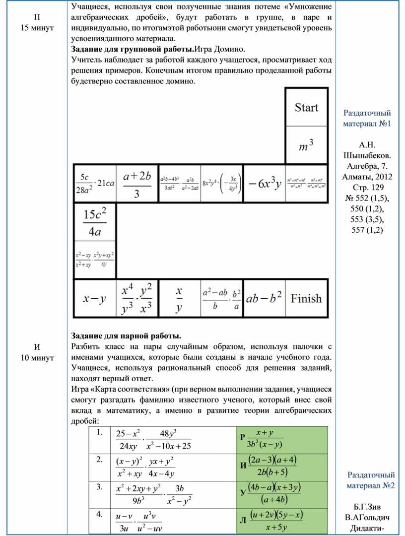 Задание для парной работы. Разбить класс на пары случайным образом, используя палочки с именами учащихся, которые были созданы в начале учебного года. Учащиеся, используя рациональный способ для решения заданий, находят верный ответ. Игра «Карта соответствия» (при верном выполнении задания, учащиеся смогут разгадать фамилию известного ученого, который внес свой вклад в математику, а именно в развитие теории алгебраических дробей: