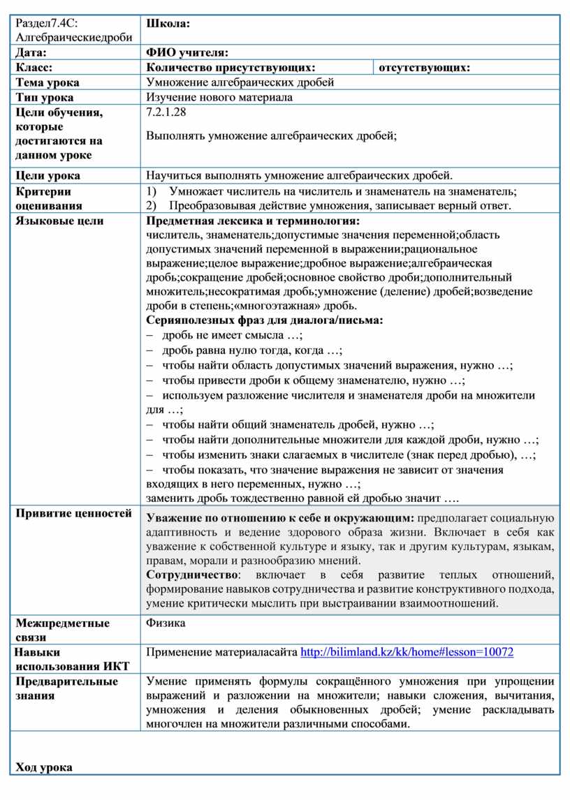 7.2.1.28 Выполнять умножение алгебраических дробей;