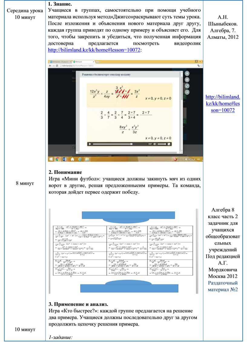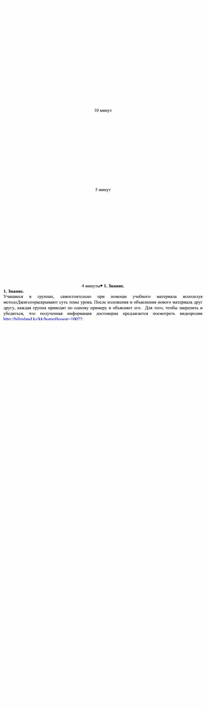 1. Знание. Учащиеся в группах, самостоятельно при помощи учебного материала используя метод«Джигсо»раскрывают суть темы урока. После изложения и объяснения нового материала друг другу, каждая группа приводят по одному примеру и объясняет его. Для того, чтобы закрепить и убедиться, что полученная информация достоверна предлагается посмотреть видеоролик http://bilimland.kz/kk/home#lesson=10072: