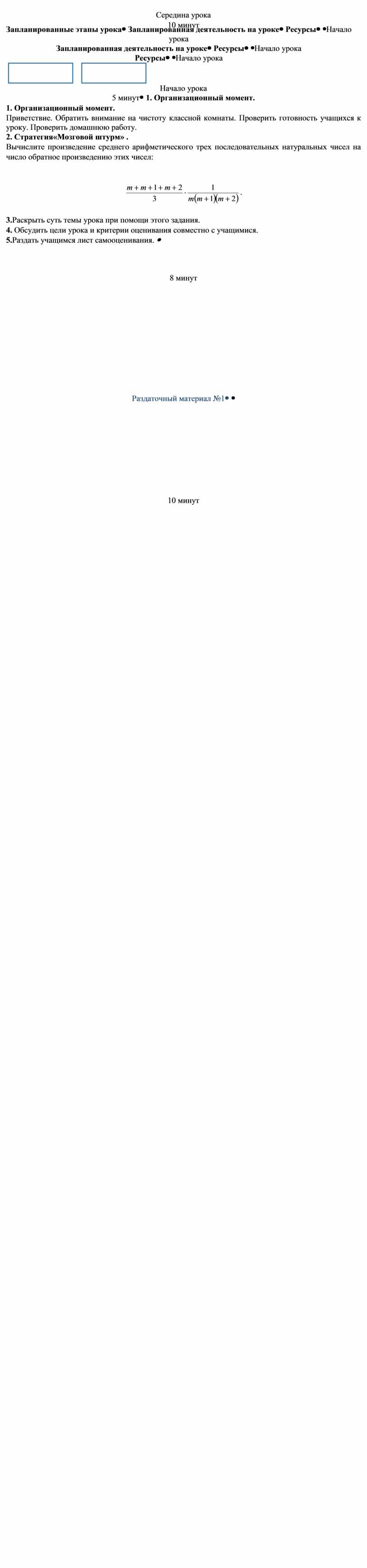 1. Организационный момент. 1. Приветствие. Обратить внимание на чистоту классной комнаты. Проверить готовность учащихся к уроку. Проверить домашнюю работу. 2. Стратегия«Мозговой штурм» . Вычислите произведение среднего арифметического трех последовательных натуральных чисел на число обратное произведению этих чисел:
