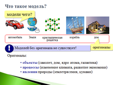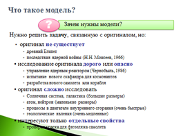 Учащиеся обсуждают данные на презентации и отвечают на вопросы: «Что такое модель?», «Для чего нужна модель?». Анализ ответа