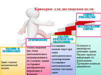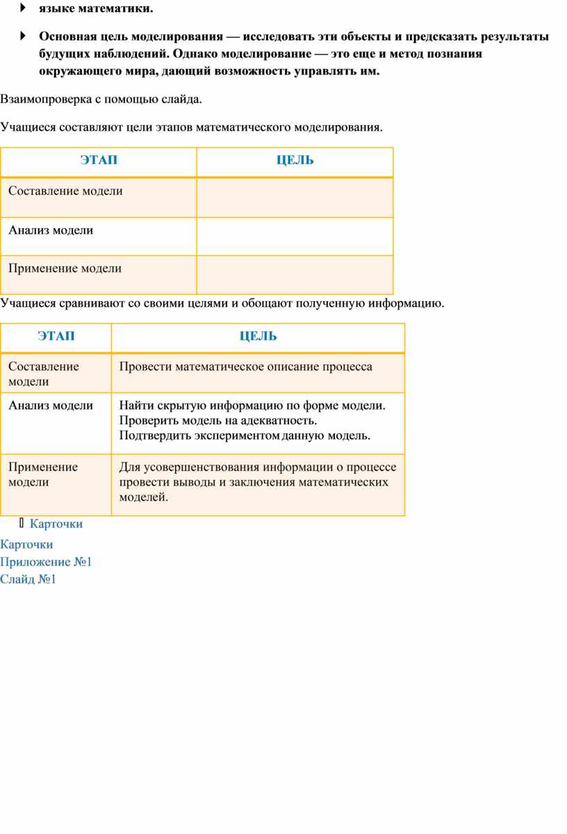 Составление определения математической модели и цели математического моделирования, через стратегию критического мышления «Перепутанные логические цепочки» } Математическая модель — это приближенное описание какого-либо класса явлений или объектов реального мира на языке математики. } Основная цель моделирования — исследовать эти объекты и предсказать результаты будущих наблюдений. Однако моделирование — это еще и метод познания окружающего мира, дающий возможность управлять им. Взаимопроверка с помощью слайда. Учащиеся составляют цели этапов математического моделирования.