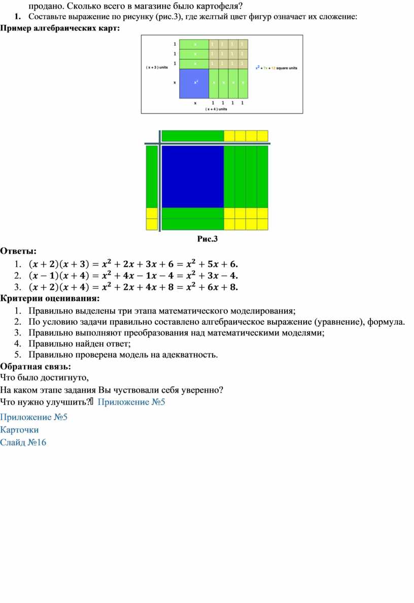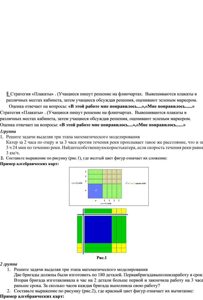 Стратегия «Плакаты» . (Учащиеся пишут решение на флипчартах. Вывешиваются плакаты в различных местах кабинета, затем учащиеся обсуждая решения, оценивают зеленым маркером. Оценка отвечает на вопросы: «В этой работе мне понравилось....»,«Мне понравилось......» 1группа 1. Решите задачи выделяя три этапа математического моделирования Катер за 2 часа по озеру и за 3 часа против течения реки проплывает такое же расстояние, что и за 3 ч 24 мин по течению реки. Найдитесобственнуюскоростькатера, если скорость течения реки равна 3 км/ч. 2. Составьте выражение по рисунку (рис.1), где желтый цвет фигур означает их сложение: Пример алгебраических карт: