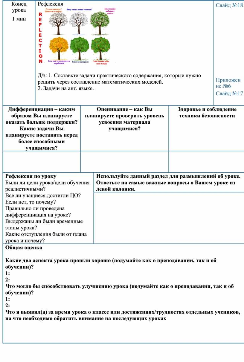 Рефлексия по уроку Были ли цели урока/цели обучения реалистичными? Все ли учащиеся достигли ЦО? Если нет, то почему? Правильно ли проведена дифференциация на уроке? Выдержаны ли были временные этапы урока? Какие отступления были от плана урока и почему? |