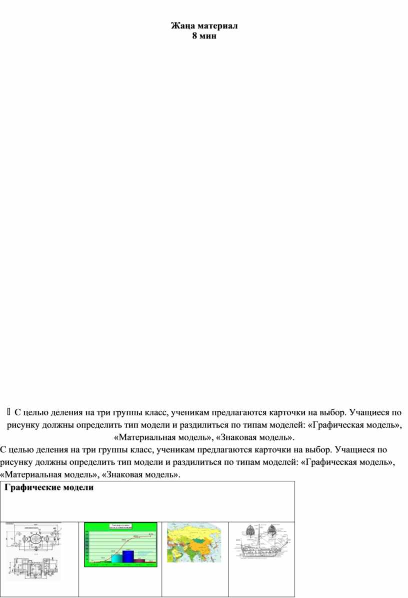 С целью деления на три группы класс, ученикам предлагаются карточки на выбор. Учащиеся по рисунку должны определить тип модели и раздилиться по типам моделей: «Графическая модель», «Материальная модель», «Знаковая модель».