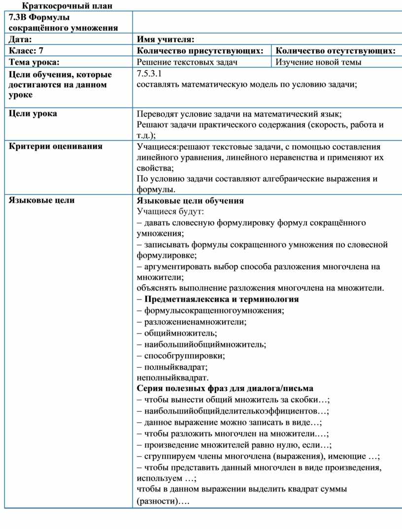 Языковые цели обучения Учащиеся будут: - давать словесную формулировку формул сокращённого умножения; - записывать формулы сокращенного умножения по словесной формулировке; - аргументировать выбор способа разложения многочлена на множители; объяснять выполнение разложения многочлена на множители. - Предметнаялексика и терминология - формулысокращенногоумножения; - разложениенамножители; - общиймножитель; - наибольшийобщиймножитель; - способгруппировки; - полныйквадрат; неполныйквадрат. Серия полезных фраз для диалога/письма - чтобы вынести общий множитель за скобки…; - наибольшийобщийделителькоэффициентов…; - данное выражение можно записать в виде…; - чтобы разложить многочлен на множители.…; - произведение множителей равно нулю, если…; - сгруппируем члены многочлена (выражения), имеющие …; - чтобы представить данный многочлен в виде произведения, используем …; чтобы в данном выражении выделить квадрат суммы (разности)…. |