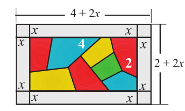 Задание 3. Дизайнер хочет по краям окна вида шебеке сделать рамку изпростого стекла. Найдите ширину рамки, если размеры окнашебеке 2 м и 4 м, площадь рамки из простого стекла 7м2.