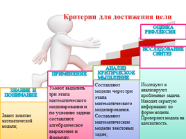 Постановка цели урока, Используйте три глагола для составления критериев урока: Вычислить, Сопоставить, Преобразовать, Применить, Проанализировать, Классифицировать, Сделать выводы. Учащиеся дополняют свои критерии с данными на слайде.