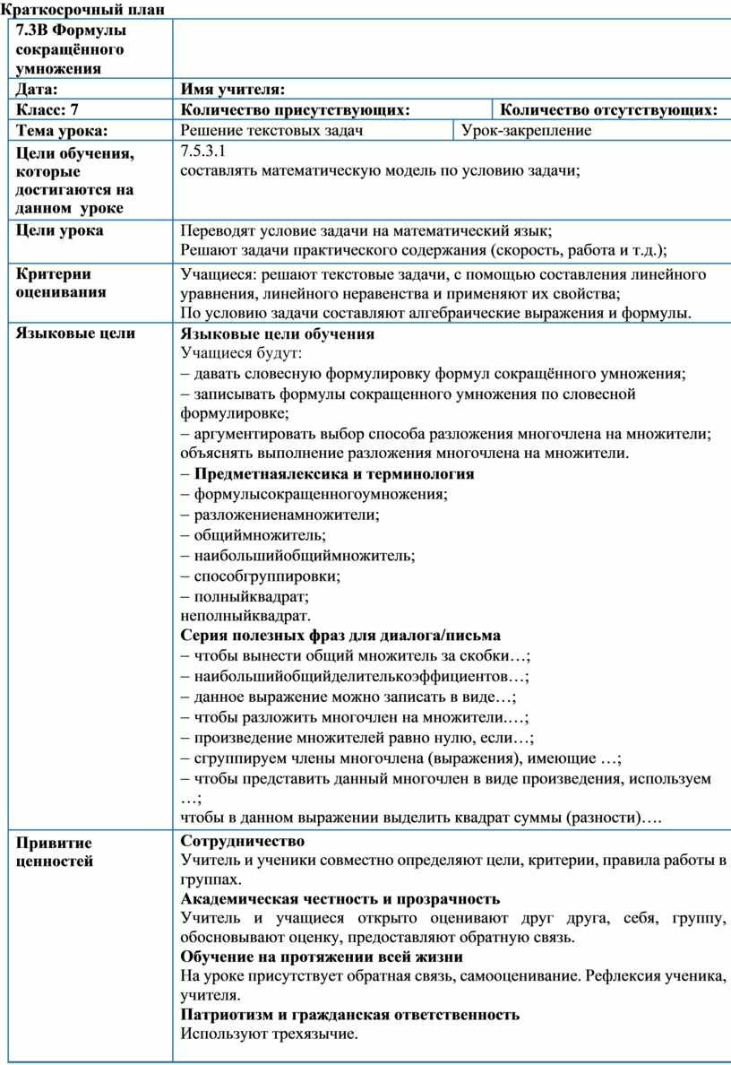 Языковые цели обучения Учащиеся будут: - давать словесную формулировку формул сокращённого умножения; - записывать формулы сокращенного умножения по словесной формулировке; - аргументировать выбор способа разложения многочлена на множители; объяснять выполнение разложения многочлена на множители. - Предметнаялексика и терминология - формулысокращенногоумножения; - разложениенамножители; - общиймножитель; - наибольшийобщиймножитель; - способгруппировки; - полныйквадрат; неполныйквадрат. Серия полезных фраз для диалога/письма - чтобы вынести общий множитель за скобки…; - наибольшийобщийделителькоэффициентов…; - данное выражение можно записать в виде…; - чтобы разложить многочлен на множители.…; - произведение множителей равно нулю, если…; - сгруппируем члены многочлена (выражения), имеющие …; - чтобы представить данный многочлен в виде произведения, используем …; чтобы в данном выражении выделить квадрат суммы (разности)…. |