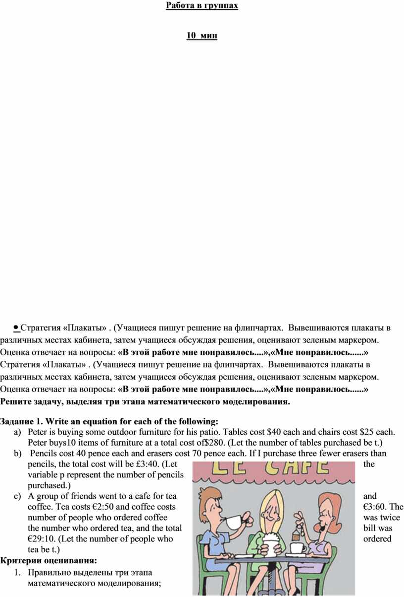 Стратегия «Плакаты» . (Учащиеся пишут решение на флипчартах. Вывешиваются плакаты в различных местах кабинета, затем учащиеся обсуждая решения, оценивают зеленым маркером. Оценка отвечает на вопросы: «В этой работе мне понравилось....»,«Мне понравилось......» Решите задачу, выделяя три этапа математического моделирования. Задание 1. Write an equation for each of the following: a) Peter is buying some outdoor furniture for his patio. Tables cost $40 each and chairs cost $25 each. Peter buys10 items of furniture at a total cost of$280. (Let the number of tables purchased be t.) b)