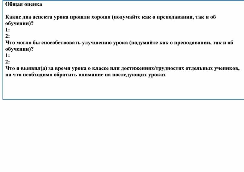 Какие два аспекта урока прошли хорошо (подумайте как о преподавании, так и об обучении)? 1: 2: Что могло бы способствовать улучшению урока (подумайте как о преподавании, так и об обучении)? 1: 2: Что я выявил(а) за время урока о классе или достижениях/трудностях отдельных учеников, на что необходимо обратить внимание на последующих уроках |