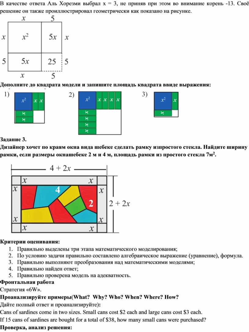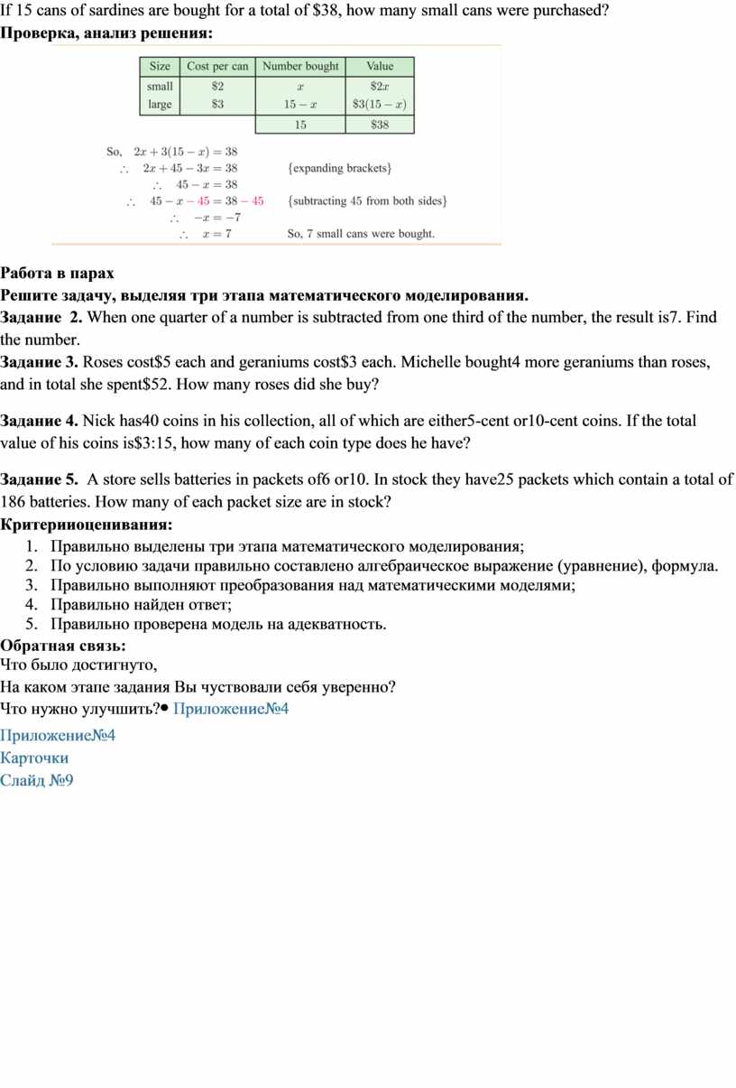 Критерии оценивания: 10. Правильно выделены три этапа математического моделирования; 11. По условию задачи правильно составлено алгебраическое выражение (уравнение), формула. 12. Правильно выполняют преобразования над математическими моделями; 13. Правильно найден ответ; 14. Правильно проверена модель на адекватность. Фронтальная работа Стратегия «6W». Проанализируйте примеры(What? Why? Who? When? Where? How? Дайте полный ответ и проанализируйте): Cans of sardines come in two sizes. Small cans cost $2 each and large cans cost $3 each. If 15 cans of sardines are bought for a total of $38, how many small cans were purchased? Проверка, анализ решения: