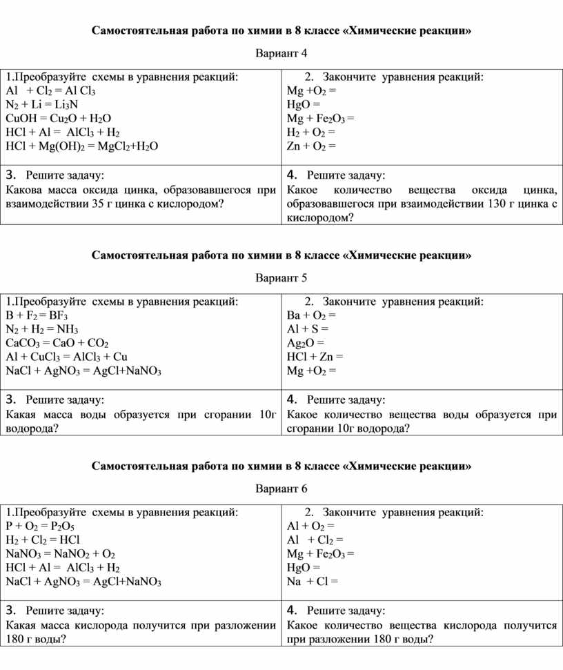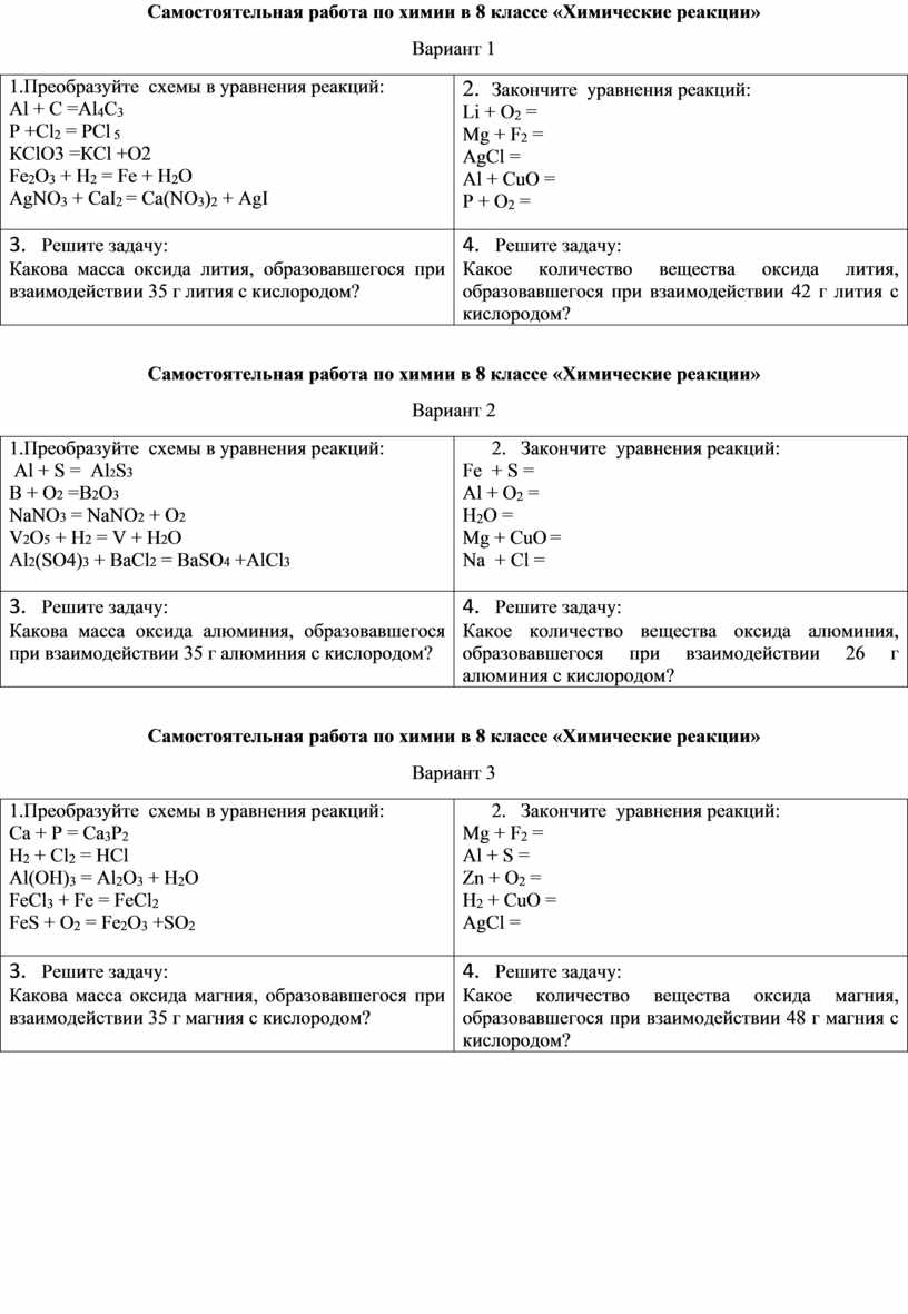 Самостоятельная работа по химии в 8 классе «Химические реакции»