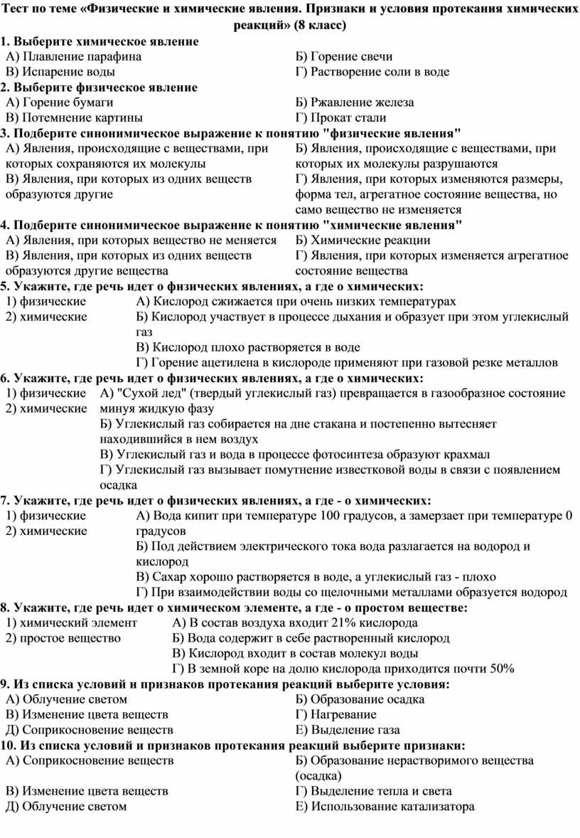Тест по теме «Физические и химические явления. Признаки и условия протекания химических реакций» (8 класс)