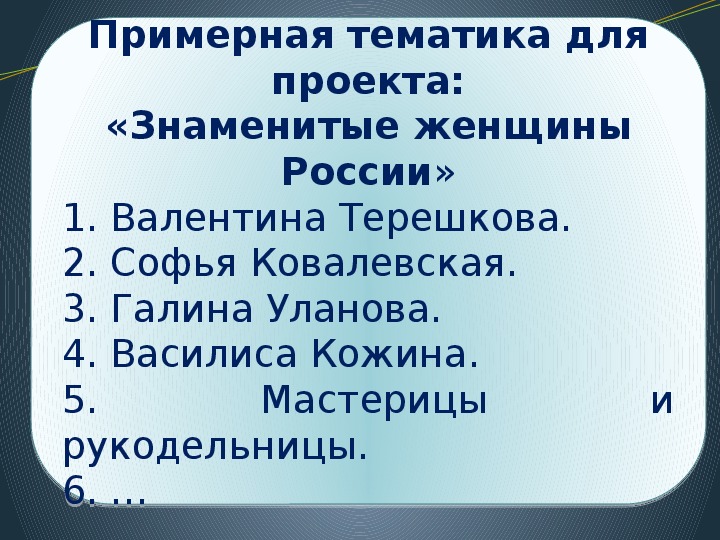 Примерная тематика для проекта:«Знаменитые женщины России»1. Валентина Терешкова.2. Софья Ковалевская.3. Галина Уланова.4. Василиса Кожина. 5. Мастерицы и рукодельницы.6. …