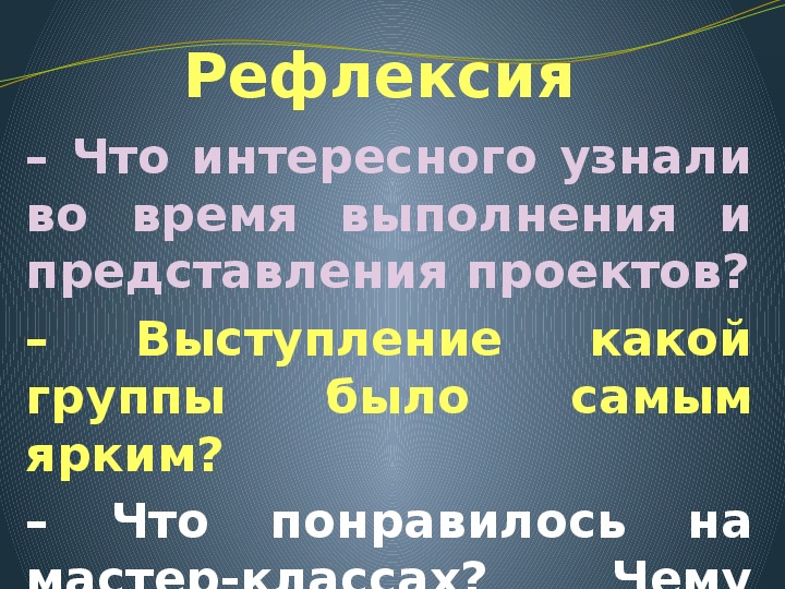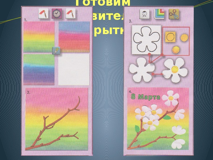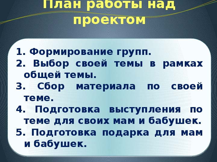 1. Формирование групп.2. Выбор своей темы в рамках общей темы.3. Сбор материала по своей теме.4. Подготовка выступления по теме для своих мам и бабушек.5. Подготовка подарка для мам и бабушек.