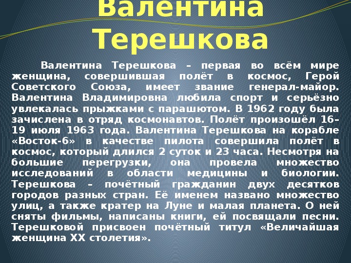 зачислена в отряд космонавтов. Полёт произошёл 16–