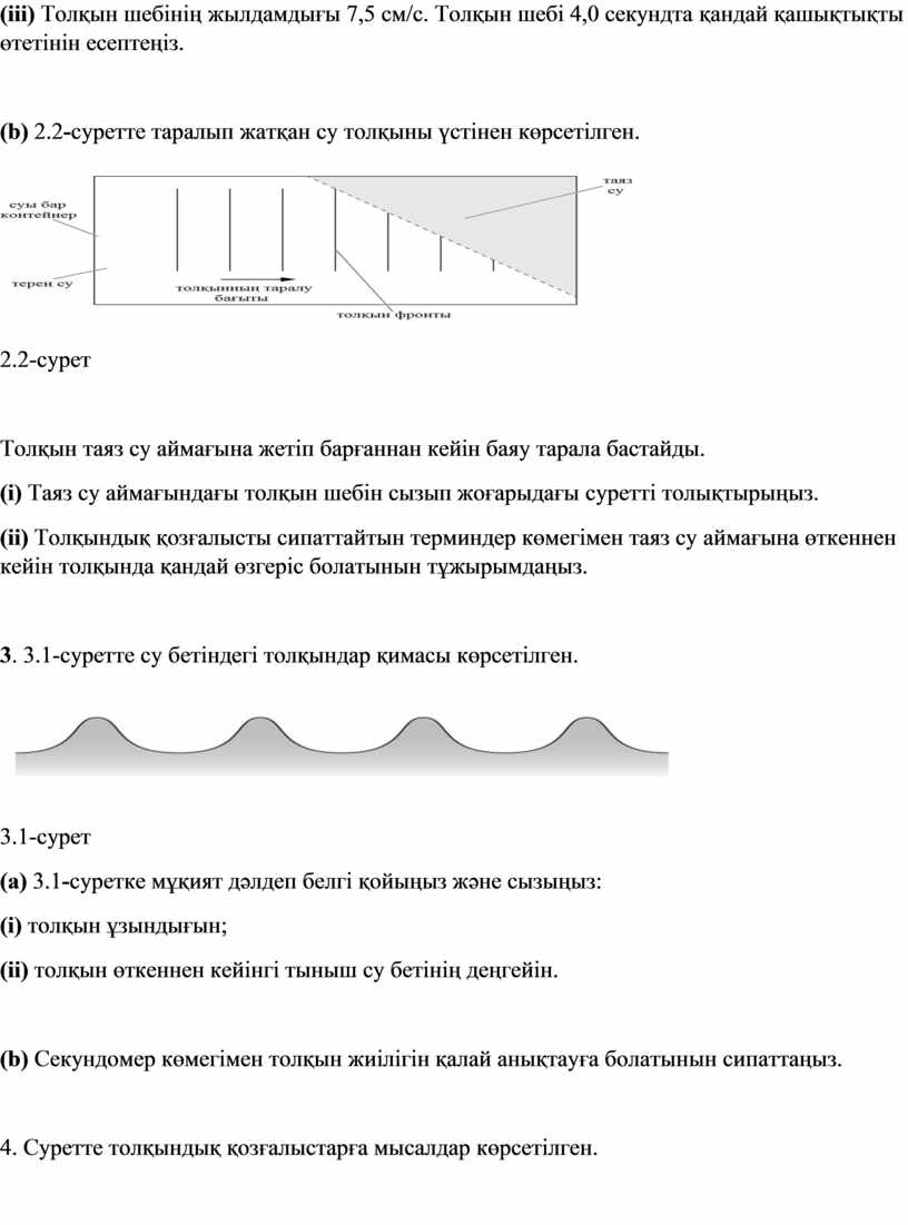 3.1-сурет (а) 3.1-суретке мұқият дәлдеп белгі қойыңыз және сызыңыз: (і) толқын ұзындығын; (іі) толқын өткеннен кейінгі тыныш су бетінің деңгейін.