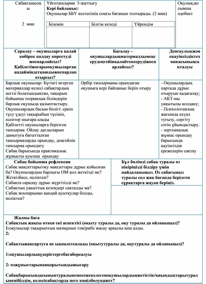Сабақ бойынша рефлексия Сабақ мақсаттары/оқу мақсаттары дұрыс қойылған ба? Оқушылардың барлығы ОМ қол жеткізді ме? Жеткізбесе, неліктен? Сабақта саралау дұрыс жүргізілді ме? Сабақтың уақыттық кезеңдері сақталды ма? Сабақ жоспарынан қандай ауытқулар болды, неліктен? |