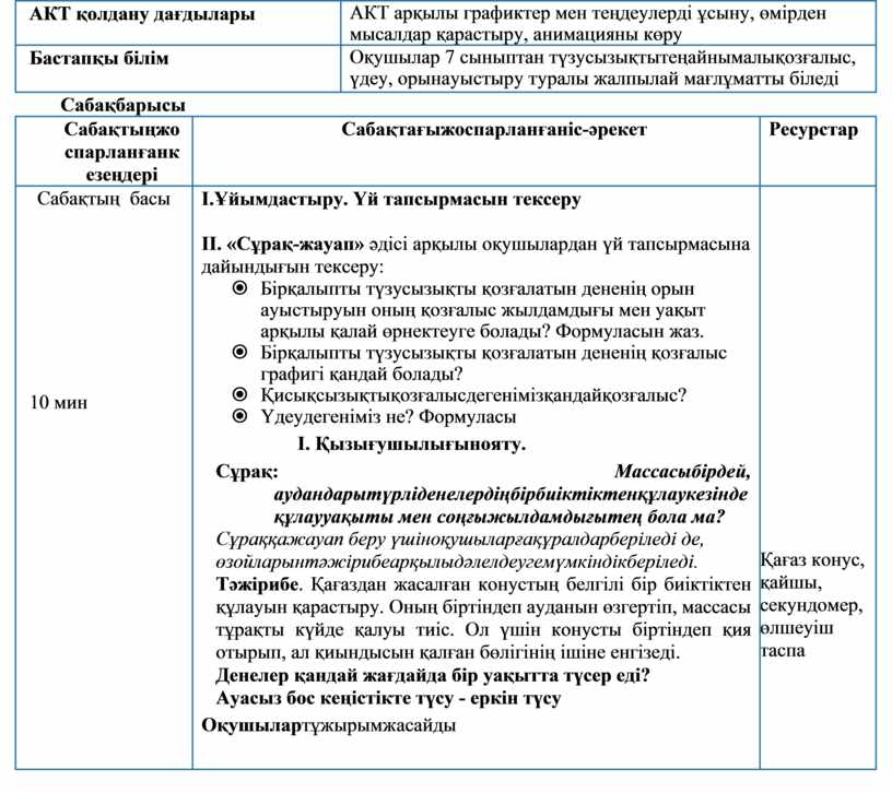 ІІ. «Сұрақ-жауап» әдісі арқылы оқушылардан үй тапсырмасына дайындығын тексеру: ž Бірқалыпты түзусызықты қозғалатын дененің орын ауыстыруын оның қозғалыс жылдамдығы мен уақыт арқылы қалай өрнектеуге болады? Формуласын жаз. ž Бірқалыпты түзусызықты қозғалатын дененің қозғалыс графигі қандай болады? ž Қисықсызықтықозғалысдегенімізқандайқозғалыс? ž Үдеудегеніміз не? Формуласы І. Қызығушылығынояту. Сұрақ: Массасыбірдей, аудандарытүрліденелердіңбірбиіктіктенқұлаукезіндеқұлаууақыты мен соңғыжылдамдығытең бола ма? Сұраққажауап беру үшіноқушыларғақұралдарберіледі де, өзойларынтәжірибеарқылыдәлелдеугемүмкіндікберіледі. Тәжірибе. Қағаздан жасалған конустың белгілі бір биіктіктен құлауын қарастыру. Оның біртіндеп ауданын өзгертіп, массасы тұрақты күйде қалуы тиіс. Ол үшін конусты біртіндеп қия отырып, ал қиындысын қалған бөлігінің ішіне енгізеді. Денелер қандай жағдайда бір уақытта түсер еді? Ауасыз бос кеңістікте түсу - еркін түсу Оқушылартұжырымжасайды |
