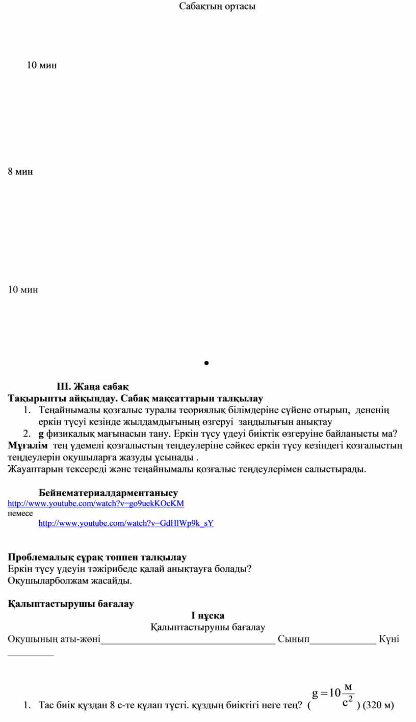 ІІІ. Жаңа сабақ Тақырыпты айқындау. Сабақ мақсаттарын талқылау 1. Теңайнымалы қозғалыс туралы теориялық білімдеріне сүйене отырып, дененің еркін түсуі кезінде жылдамдығының өзгеруі заңдылығын анықтау 2. g физикалық мағынасын тану. Еркін түсу үдеуі биіктік өзгеруіне байланысты ма? Мұғалім тең үдемелі қозғалыстың теңдеулеріне сәйкес еркін түсу кезіндегі қозғалыстың теңдеулерін оқушыларға жазуды ұсынады . Жауаптарын тексереді және теңайнымалы қозғалыс теңдеулерімен салыстырады.