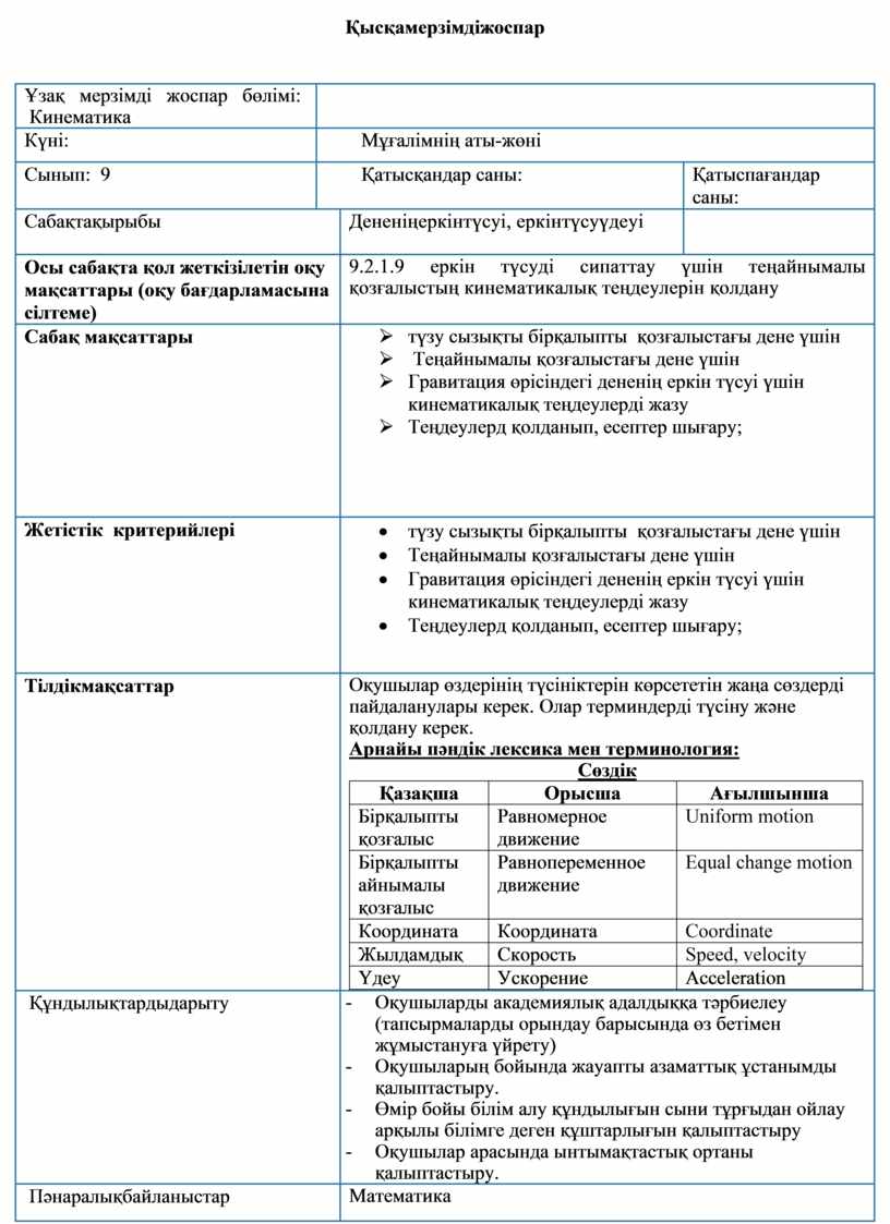 · түзу сызықты бірқалыпты қозғалыстағы дене үшін · Теңайнымалы қозғалыстағы дене үшін · Гравитация өрісіндегі дененің еркін түсуі үшін кинематикалық теңдеулерді жазу · Теңдеулерд қолданып, есептер шығару; |