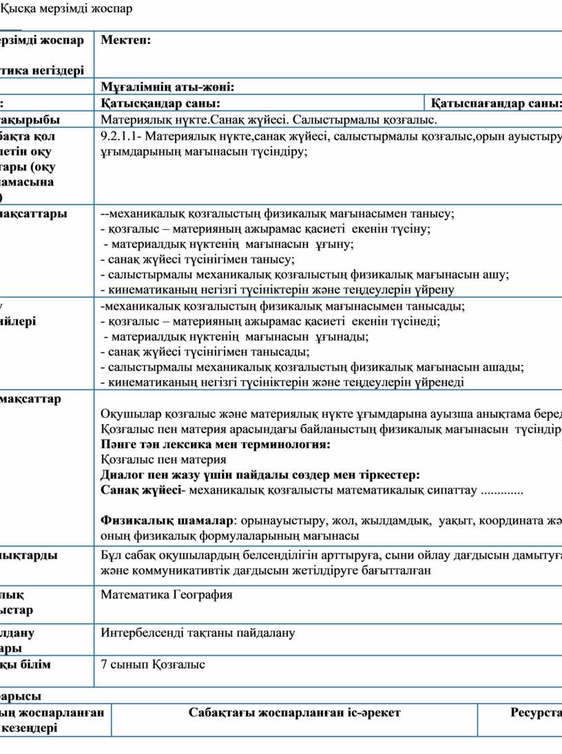 Оқушылар қозғалыс және материялық нүкте ұғымдарына ауызша анықтама береді. Қозғалыс пен материя арасындағы байланыстың физикалық мағынасын түсіндіреді Пәнге тән лексика мен терминология: Қозғалыс пен материя Диалог пен жазу үшін пайдалы сөздер мен тіркестер: Санақ жүйесі- механикалық қозғалысты математикалық сипаттау .............