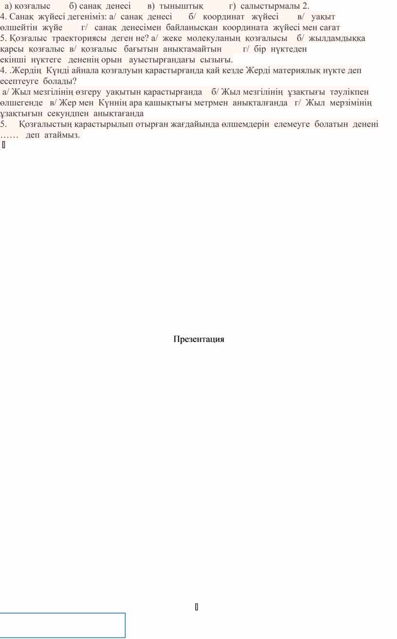 IҮ. Материялық нүкте деп қозғалыстың қарастырылып отырған жағдайында өлшемдерін елемеуге болатын денені айтады. Дененің немесе материялық нүктенің санақ денесімен салыстырғандағы қозғалысы кезінде сызық түрінде қалдырған ізі қозғалыс траекториясы деп аталады. Поезд жүретін темір жол –поездың, тас жол –автомобильдердің, ұшақтың артында қалған тұманды із-ұшақтың, соқпақ жол- жаяу адамның қозғалыс траекториясын көрсетеді. Қозғалыс траекториясының пішіні әр түрлі санақ денесіне қатысты түрліше болады. Қозғалысты түзусызықты немесе қисықсызықты деп бөледі. Мысалы: шеңбер бойымен, парабола бойымен қозғ. Ү. «Білгенімді зердеме тоқу» тест 1/ Төмендегі жағдайлардың қайсысында денені материялық нүкте деп есептеуге болады: а) ұшақ Астанадан Мәскеуге сапар шекті. б) конькиші жарыс мәресінен өтті. Мәнерлеп коньки тебуші еркін жаттығу орындауда. в) ғарыш кемесінің қозғалысын Жердегі басқару орталығынан бақылайды. Екі ғарыш кемесі түйісу сәтінде. 2/ Мына денелер: метро эскалаторында тұрған адам; төмпешіктен секірген шаңғышы; тігін машинасының инесі- Жермен салыстырғанда түзу сызықпен қозғала ма, әлде қисық сызықпен қозғала ма? 3. Бүкіл материалық дүниеге тән қасиет… а) қозғалыс б) санақ денесі в) тыныштық г) салыстырмалы 2. 4. Санақ жүйесі дегеніміз: а/ санақ денесі б/ координат жүйесі в/ уақыт өлшейтін жүйе г/ санақ денесімен байланысқан координата жүйесі мен сағат 5. Қозғалыс траекториясы деген не? а/ жеке молекуланың қозғалысы б/ жылдамдыққа қарсы қозғалыс в/ қозғалыс бағытын анықтамайтын г/ бір нүктеден екінші нүктеге дененің орын ауыстырғандағы сызығы. 4. .Жердің Күнді айнала қозғалуын қарастырғанда қай кезде Жерді материялық нүкте деп есептеуге болады? а/ Жыл мезгілінің өзгеру уақытын қарастырғанда б/ Жыл мезгілінің ұзақтығы тәулікпен өлшегенде в/ Жер мен Күннің ара қашықтығы метрмен анықталғанда г/ Жыл мерзімінің ұзақтығын секундпен анықтағанда 5. Қозғалыстың қарастырылып отырған жағдайында өлшемдерін елемеуге болатын денені …… деп атаймыз.