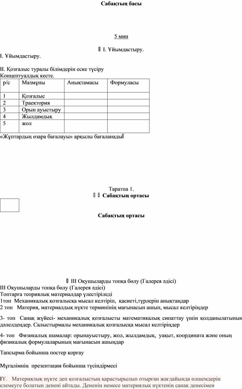 II. Қозғалыс туралы білімдерін еске түсіру Концептуалдық кесте.