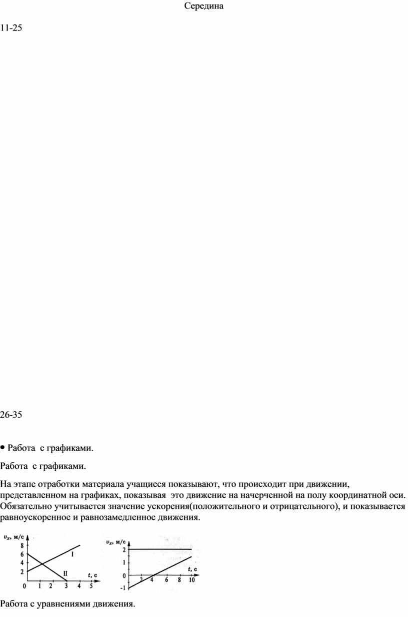 Работа с графиками. На этапе отработки материала учащиеся показывают, что происходит при движении, представленном на графиках, показывая это движение на начерченной на полу координатной оси. Обязательно учитывается значение ускорения(положительного и отрицательного), и показывается равноускоренное и равнозамедленное движения.