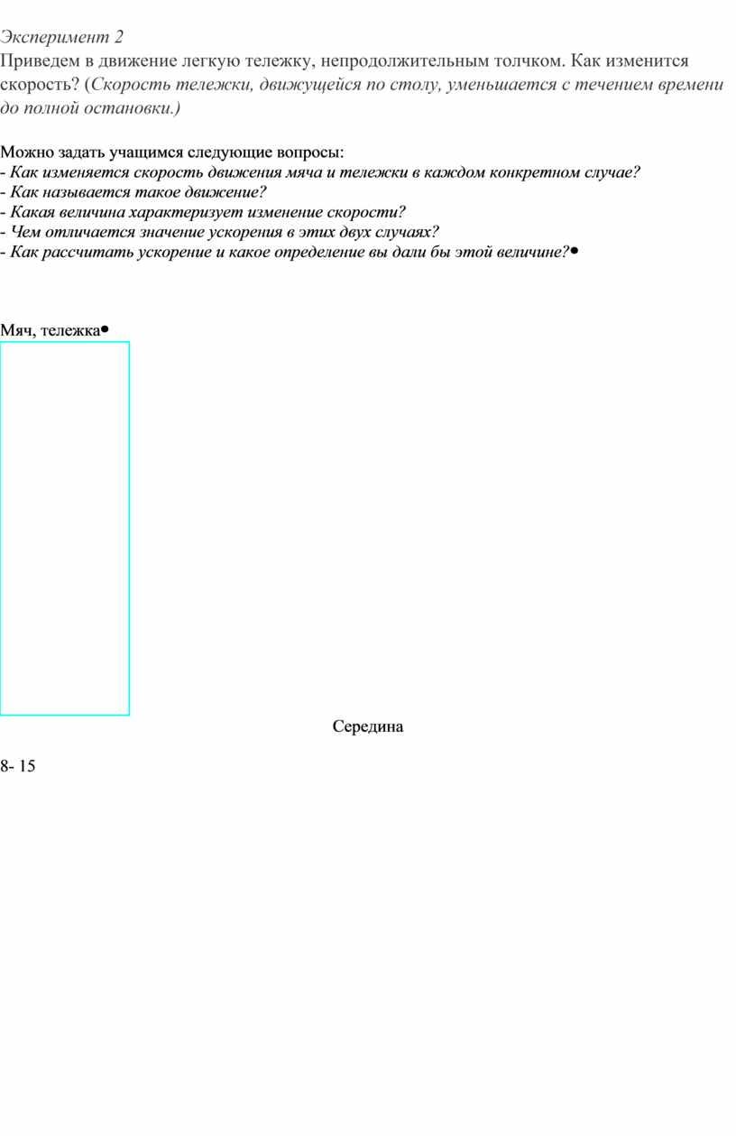 Можно задать учащимся следующие вопросы: - Как изменяется скорость движения мяча и тележки в каждом конкретном случае? - Как называется такое движение? - Какая величина характеризует изменение скорости? - Чем отличается значение ускорения в этих двух случаях? - Как рассчитать ускорение и какое определение вы дали бы этой величине? |