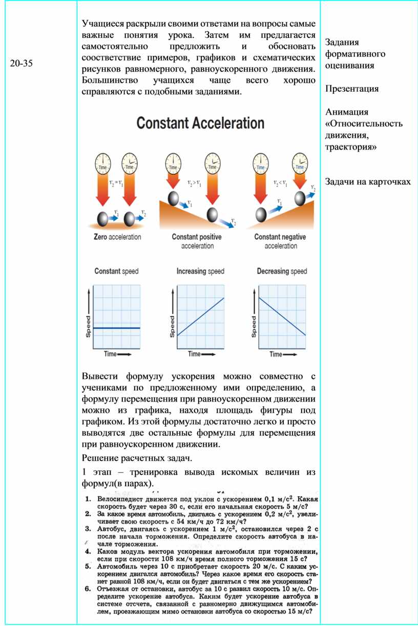 Учащиеся раскрыли своими ответами на вопросы самые важные понятия урока. Затем им предлагается самостоятельно предложить и обосновать соостветствие примеров, графиков и схематических рисунков равномерного, равноускоренного движения. Большинство учащихся чаще всего хорошо справляются с подобными заданиями.