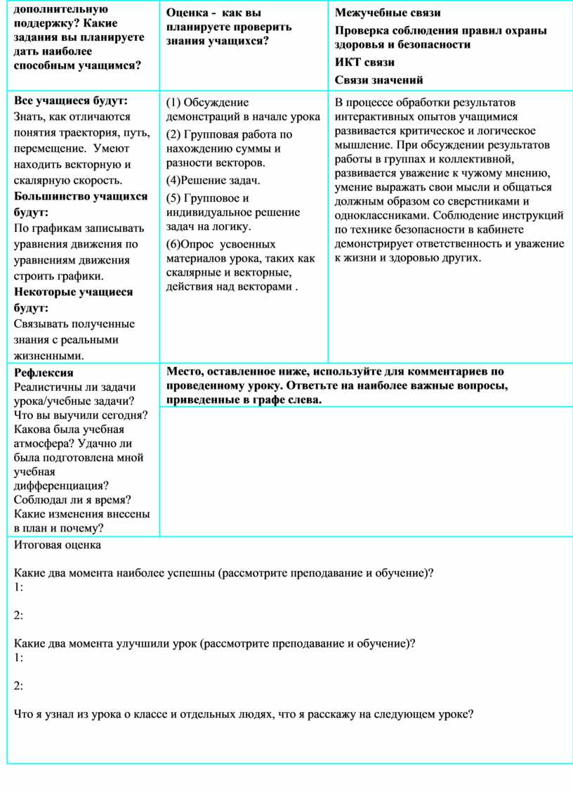 Все учащиеся будут: Знать, как отличаются понятия траектория, путь, перемещение. Умеют находить векторную и скалярную скорость. Большинство учащихся будут: По графикам записывать уравнения движения по уравнениям движения строить графики. Некоторые учащиеся будут: Связывать полученные знания с реальными жизненными. |