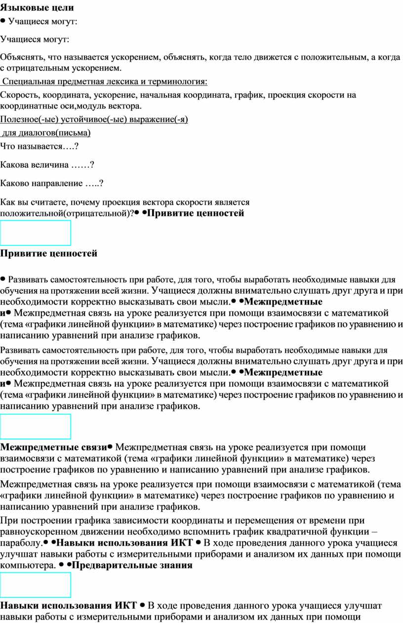 Учащиеся могут: Объяснять, что называется ускорением, объяснять, когда тело движется с положительным, а когда с отрицательным ускорением. Специальная предметная лексика и терминология: Скорость, координата, ускорение, начальная координата, график, проекция скорости на координатные оси,модуль вектора. Полезное(-ые) устойчивое(-ые) выражение(-я) для диалогов(письма) Что называется….? Какова величина ……? Каково направление …..? Как вы считаете, почему проекция вектора скорости является положительной(отрицательной)? |
