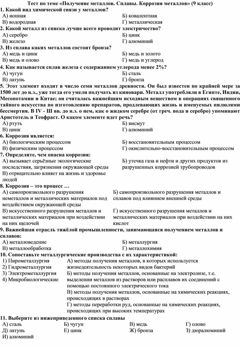 Тест по теме «Получение металлов. Сплавы. Коррозия металлов» (9 класс)