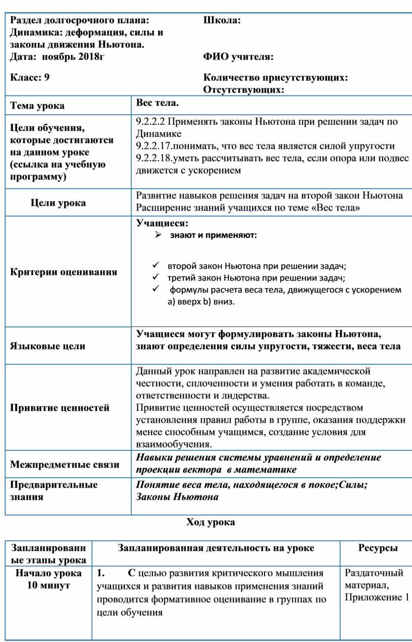 9.2.2.2 Применять законы Ньютона при решении задач по Динамике 9.2.2.17.понимать, что вес тела является силой упругости 9.2.2.18.уметь рассчитывать вес тела, если опора или подвес движется с ускорением