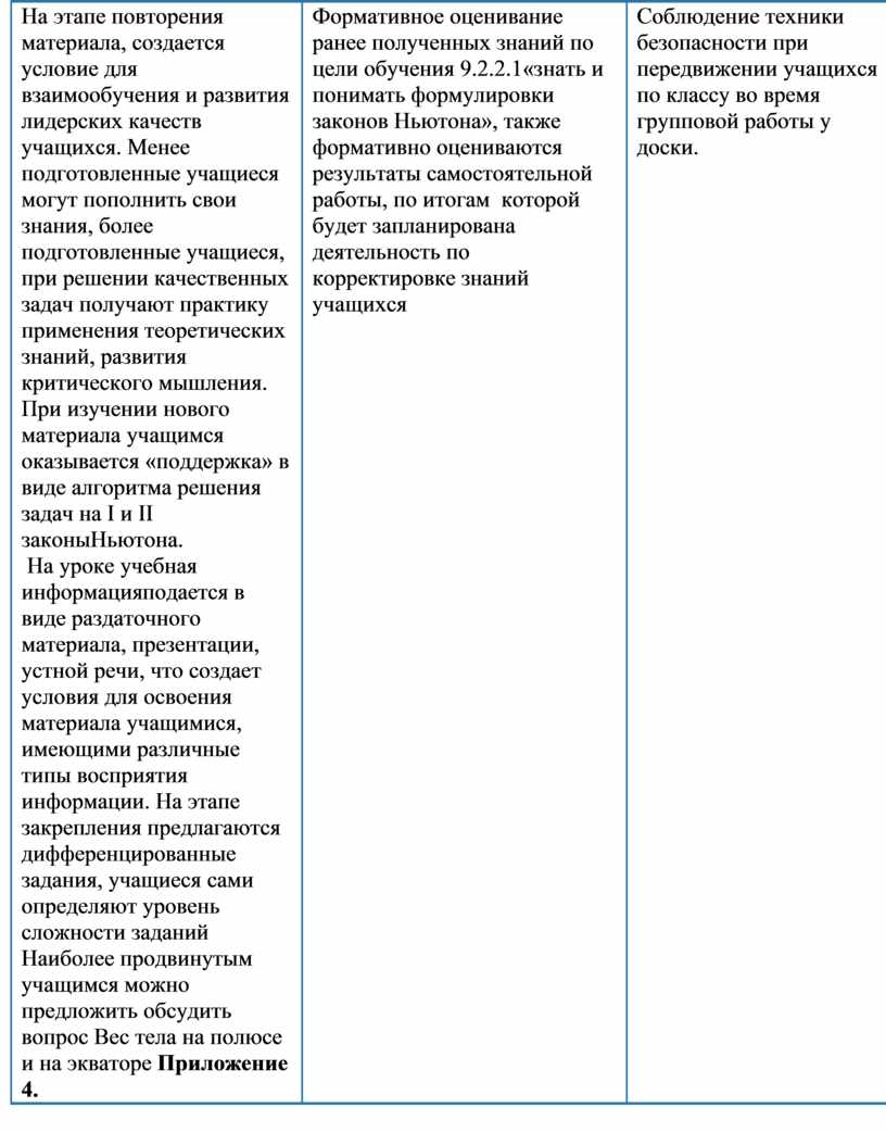 На этапе повторения материала, создается условие для взаимообучения и развития лидерских качеств учащихся. Менее подготовленные учащиеся могут пополнить свои знания, более подготовленные учащиеся, при решении качественных задач получают практику применения теоретических знаний, развития критического мышления. При изучении нового материала учащимся оказывается «поддержка» в виде алгоритма решения задач на I и II законыНьютона. На уроке учебная информацияподается в виде раздаточного материала, презентации, устной речи, что создает условия для освоения материала учащимися, имеющими различные типы восприятия информации. На этапе закрепления предлагаются дифференцированные задания, учащиеся сами определяют уровень сложности заданий Наиболее продвинутым учащимся можно предложить обсудить вопрос Вес тела на полюсе и на экваторе Приложение 4. |