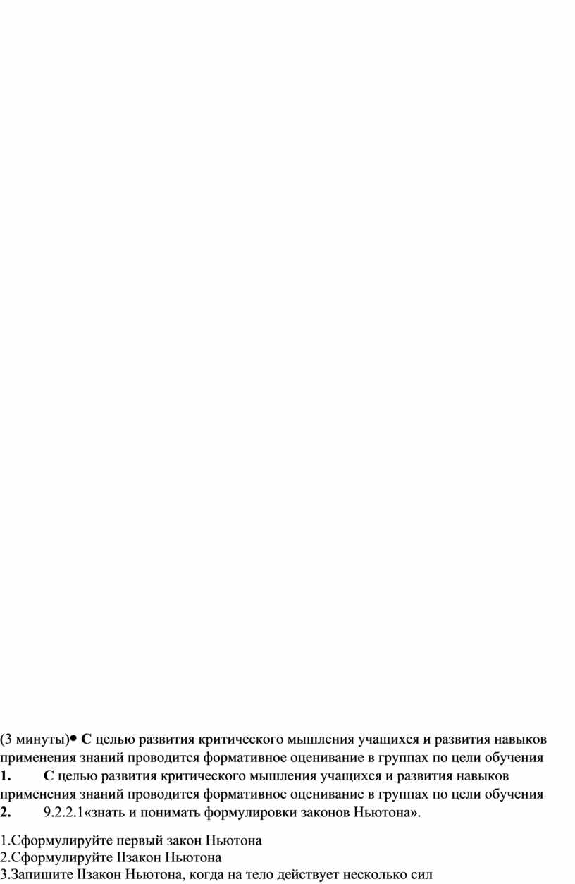 Формативное оценивание ранее полученных знаний по цели обучения 9.2.2.1«знать и понимать формулировки законов Ньютона», также формативно оцениваются результаты самостоятельной работы, по итогам которой будет запланирована деятельность по корректировке знаний учащихся |