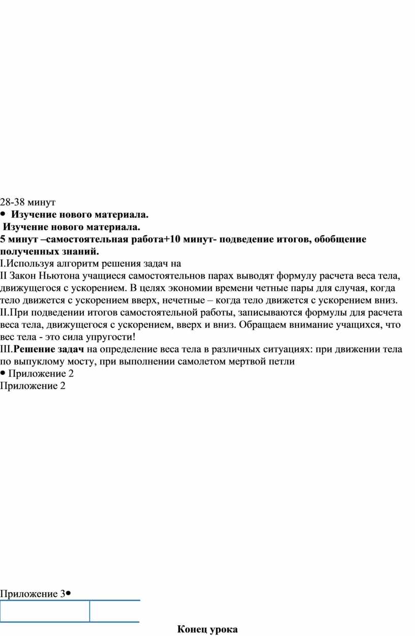 Изучение нового материала. 5 минут –самостоятельная работа+10 минут- подведение итогов, обобщение полученных знаний. I.Используя алгоритм решения задач на II Закон Ньютона учащиеся самостоятельнов парах выводят формулу расчета веса тела, движущегося с ускорением. В целях экономии времени четные пары для случая, когда тело движется с ускорением вверх, нечетные – когда тело движется с ускорением вниз. II.При подведении итогов самостоятельной работы, записываются формулы для расчета веса тела, движущегося с ускорением, вверх и вниз. Обращаем внимание учащихся, что вес тела - это сила упругости! III.Решение задач на определение веса тела в различных ситуациях: при движении тела по выпуклому мосту, при выполнении самолетом мертвой петли