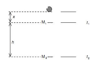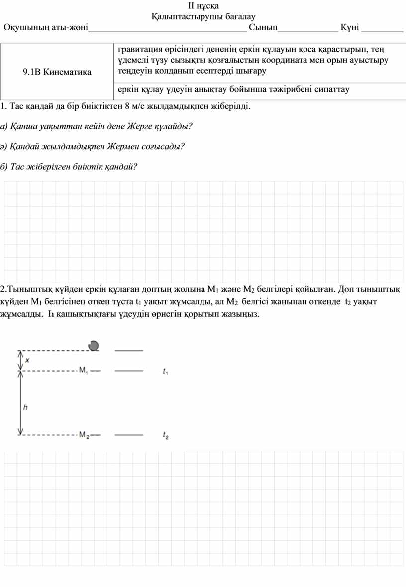 2.Тыныштық күйден еркін құлаған доптың жолына М1 және М2 белгілері қойылған. Доп тыныштық күйден М1 белгісінен өткен тұста t1 уақыт жұмсалды, ал М2 белгісі жанынан өткенде t2 уақыт жұмсалды. Һ қашықтықтағы үдеудің өрнегін қорытып жазыңыз.