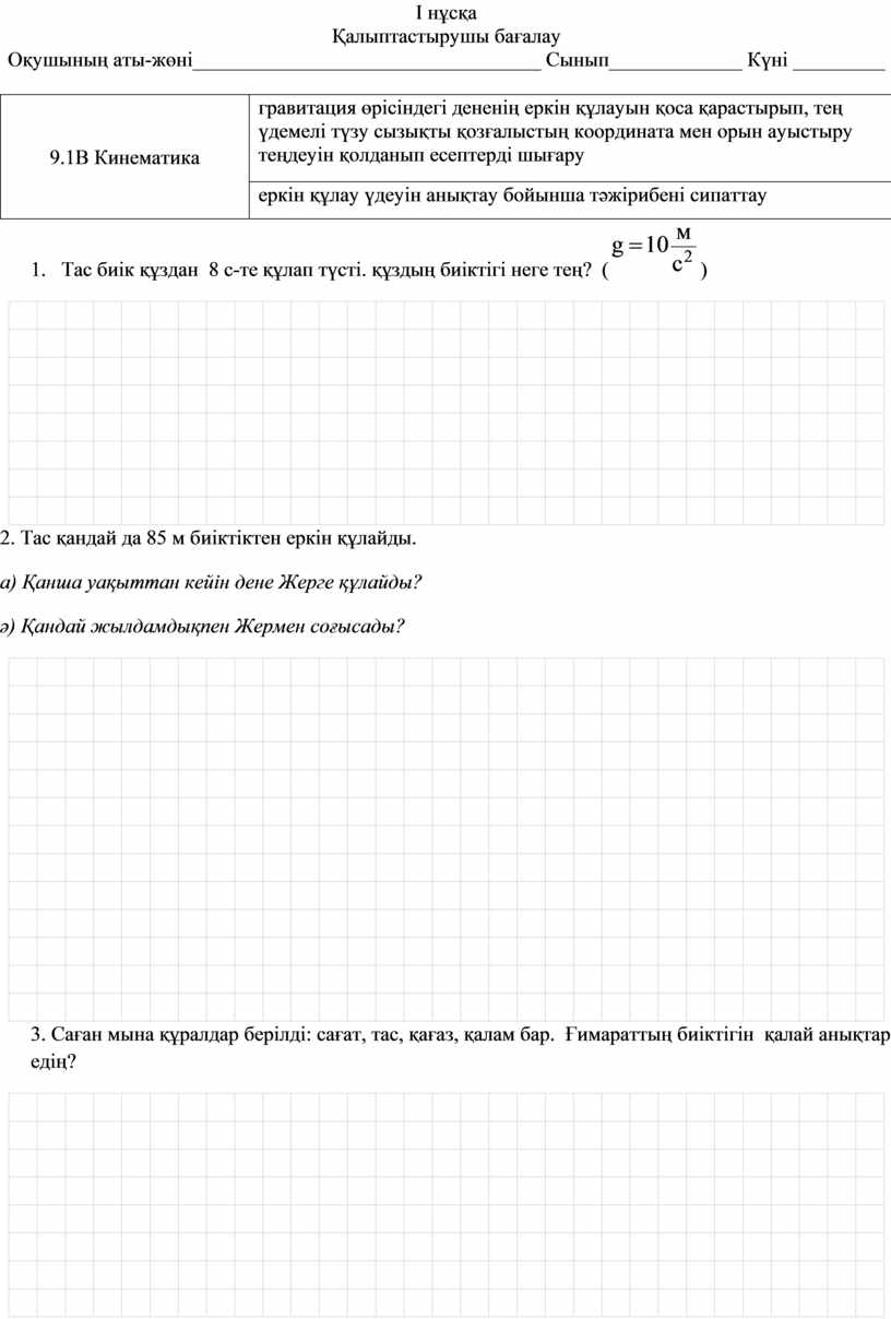 гравитация өрісіндегі дененің еркін құлауын қоса қарастырып, тең үдемелі түзу сызықты қозғалыстың координата мен орын ауыстыру теңдеуін қолданып есептерді шығару |