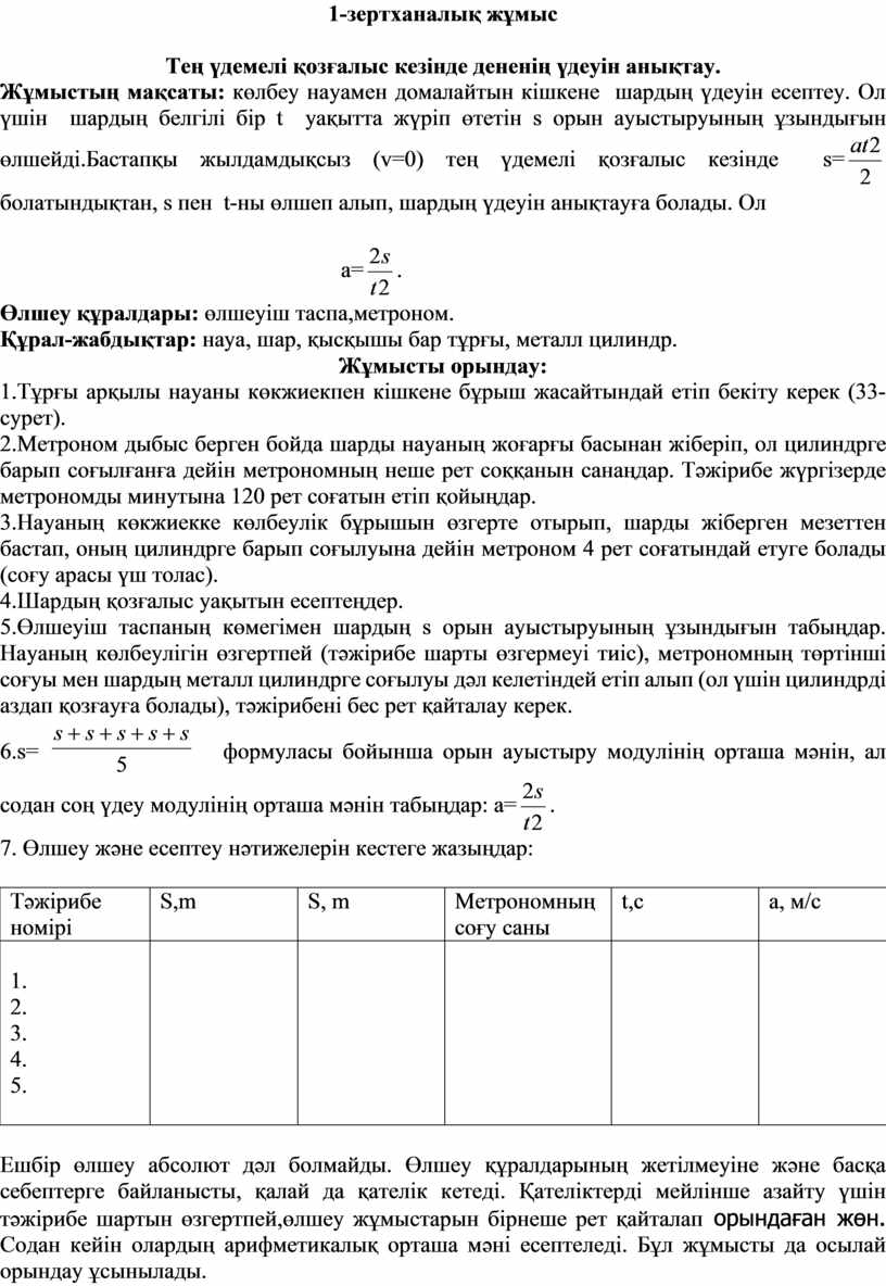 s пен t-ны өлшеп алып, шардың үдеуін анықтауға