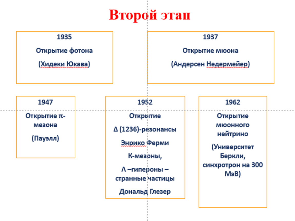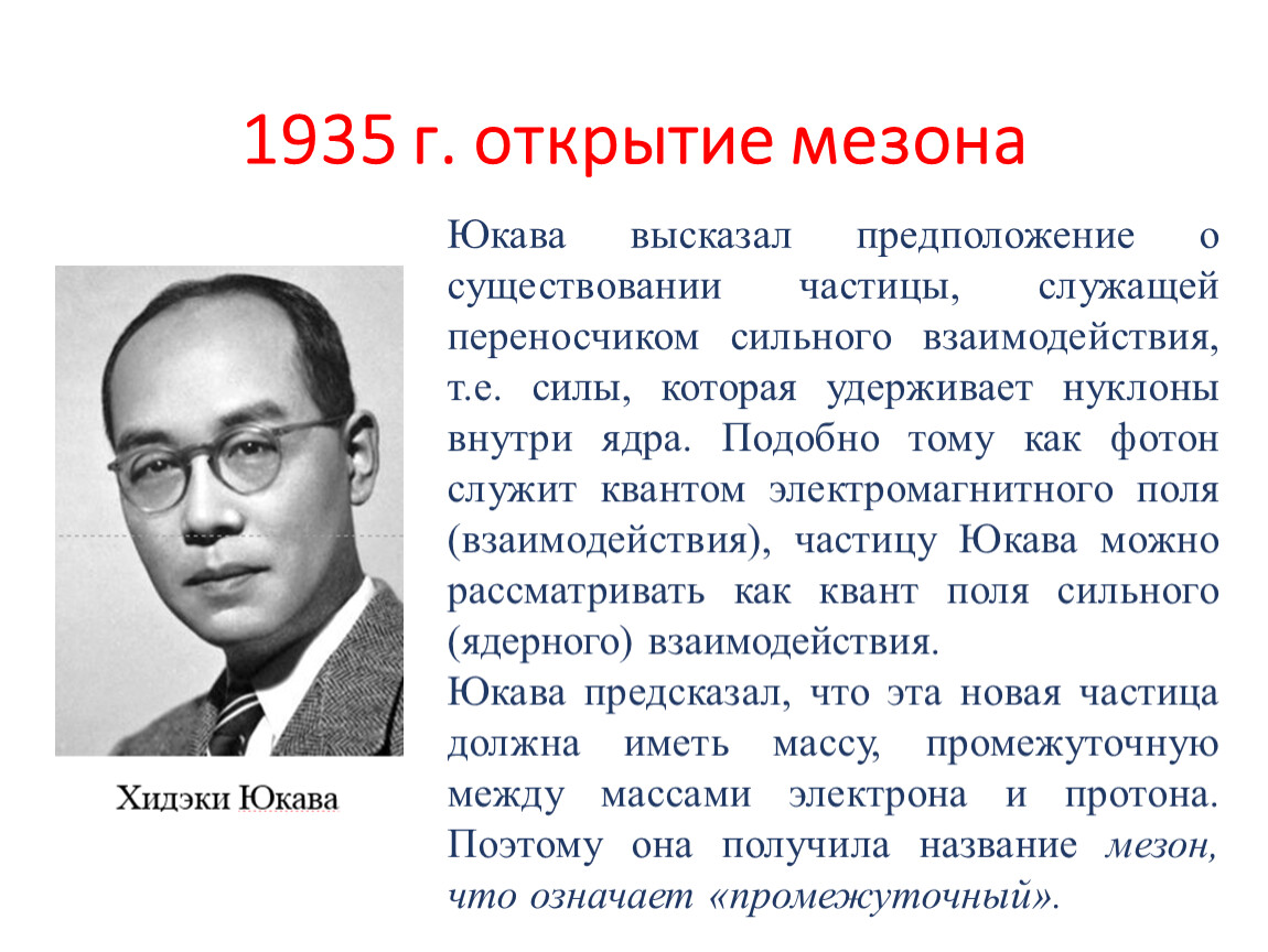 Юкава предсказал, что эта новая частица должна иметь массу, промежуточную между массами электрона и протона. Поэтому она получила название мезон, что означает «промежуточный».