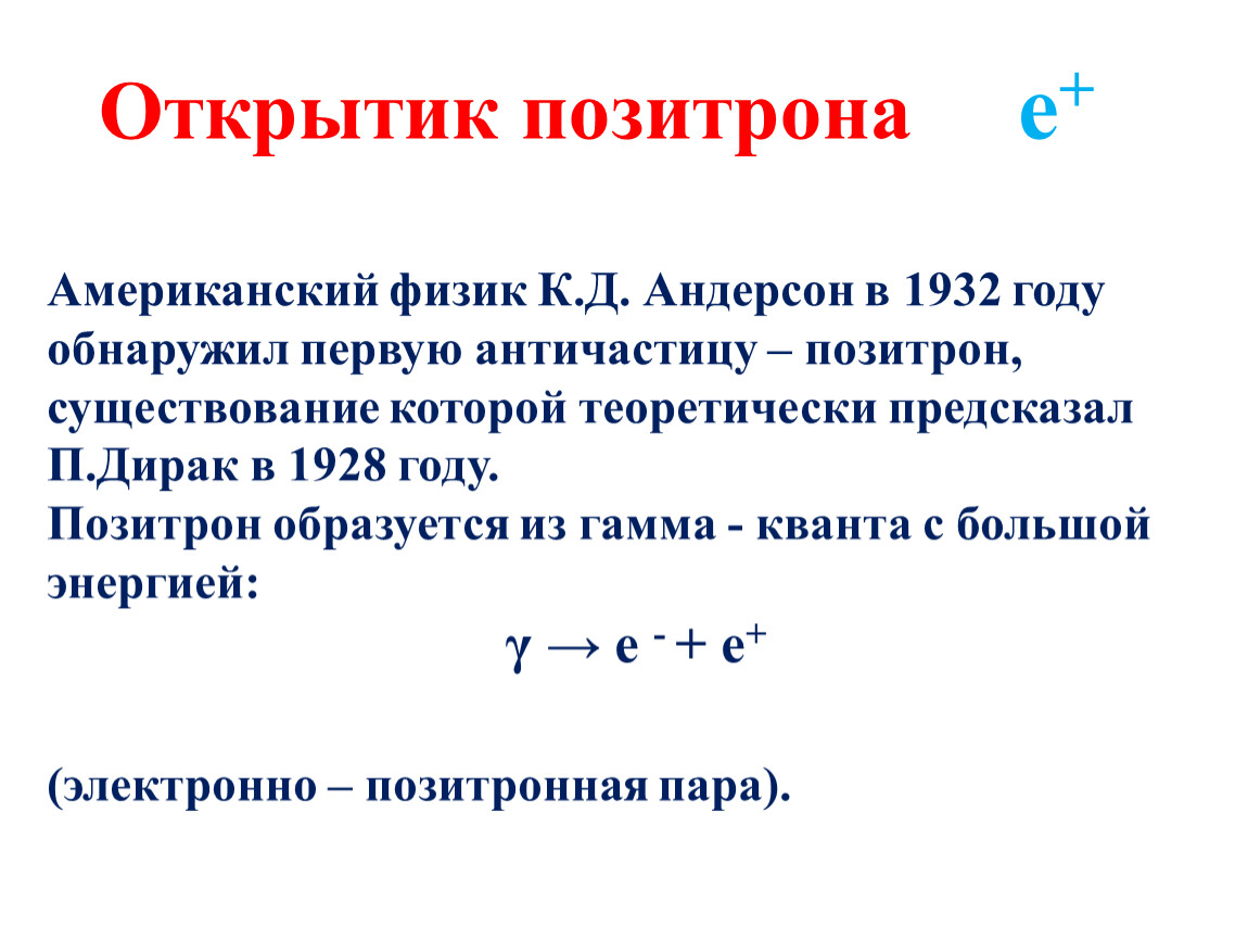 Американский физик К.Д. Андерсон в 1932 году обнаружил первую античастицу – позитрон, существование которой теоретически предсказал П.Дирак в 1928 году.