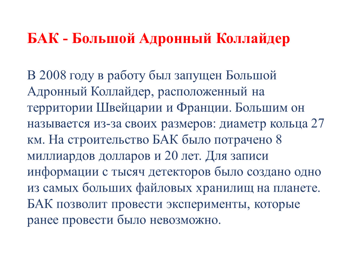 В 2008 году в работу был запущен Большой Адронный Коллайдер, расположенный на территории Швейцарии и Франции. Большим он называется из-за своих размеров: диаметр кольца 27 км. На строительство БАК было потрачено 8 миллиардов долларов и 20 лет. Для записи информации с тысяч детекторов было создано одно из самых больших файловых хранилищ на планете. БАК позволит провести эксперименты, которые ранее провести было невозможно.