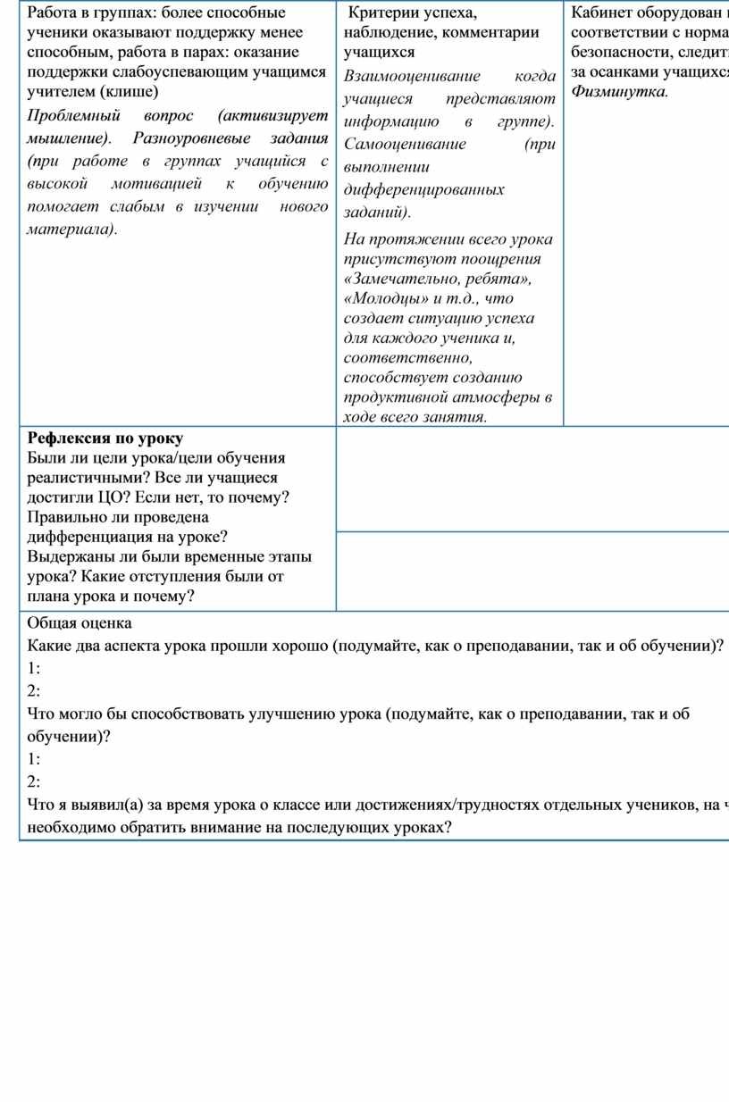 Общая оценка Какие два аспекта урока прошли хорошо (подумайте, как о преподавании, так и об обучении)? 1: 2: Что могло бы способствовать улучшению урока (подумайте, как о преподавании, так и об обучении)? 1: 2: Что я выявил(а) за время урока о классе или достижениях/трудностях отдельных учеников, на что необходимо обратить внимание на последующих уроках? |