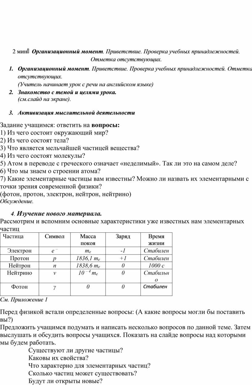 3. Активизация мыслительной деятельности Задание учащимся: ответить на вопросы: 1) Из чего состоит окружающий мир? 2) Из чего состоят тела? 3) Что является мельчайшей частицей вещества? 4) Из чего состоят молекулы? 5) Атом в переводе с греческого означает «неделимый». Так ли это на самом деле? 6) Что мы знаем о строении атома? 7) Какие элементарные частицы вам известны? Можно ли назвать их элементарными с точки зрения современной физики? (фотон, протон, электрон, нейтрон, нейтрино) Обсуждение. 4. Изучение нового материала. Рассмотрим и вспомним основные характеристики уже известных нам элементарных частиц