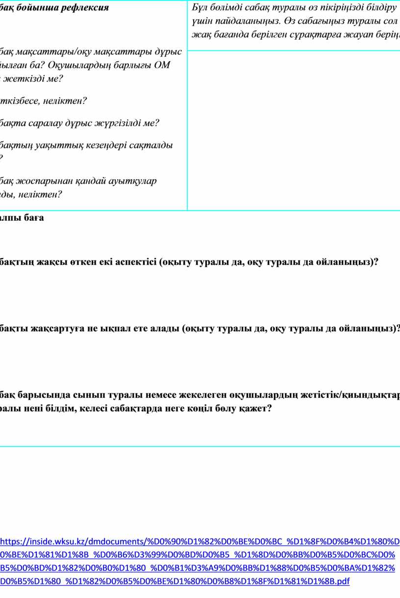 Сабақтың жақсы өткен екі аспектісі (оқыту туралы да, оқу туралы да ойланыңыз)? 1: 2: Сабақты жақсартуға не ықпал ете алады (оқыту туралы да, оқу туралы да ойланыңыз)? 1: 2: Сабақ барысында сынып туралы немесе жекелеген оқушылардың жетістік/қиындықтары туралы нені білдім, келесі сабақтарда неге көңіл бөлу қажет?