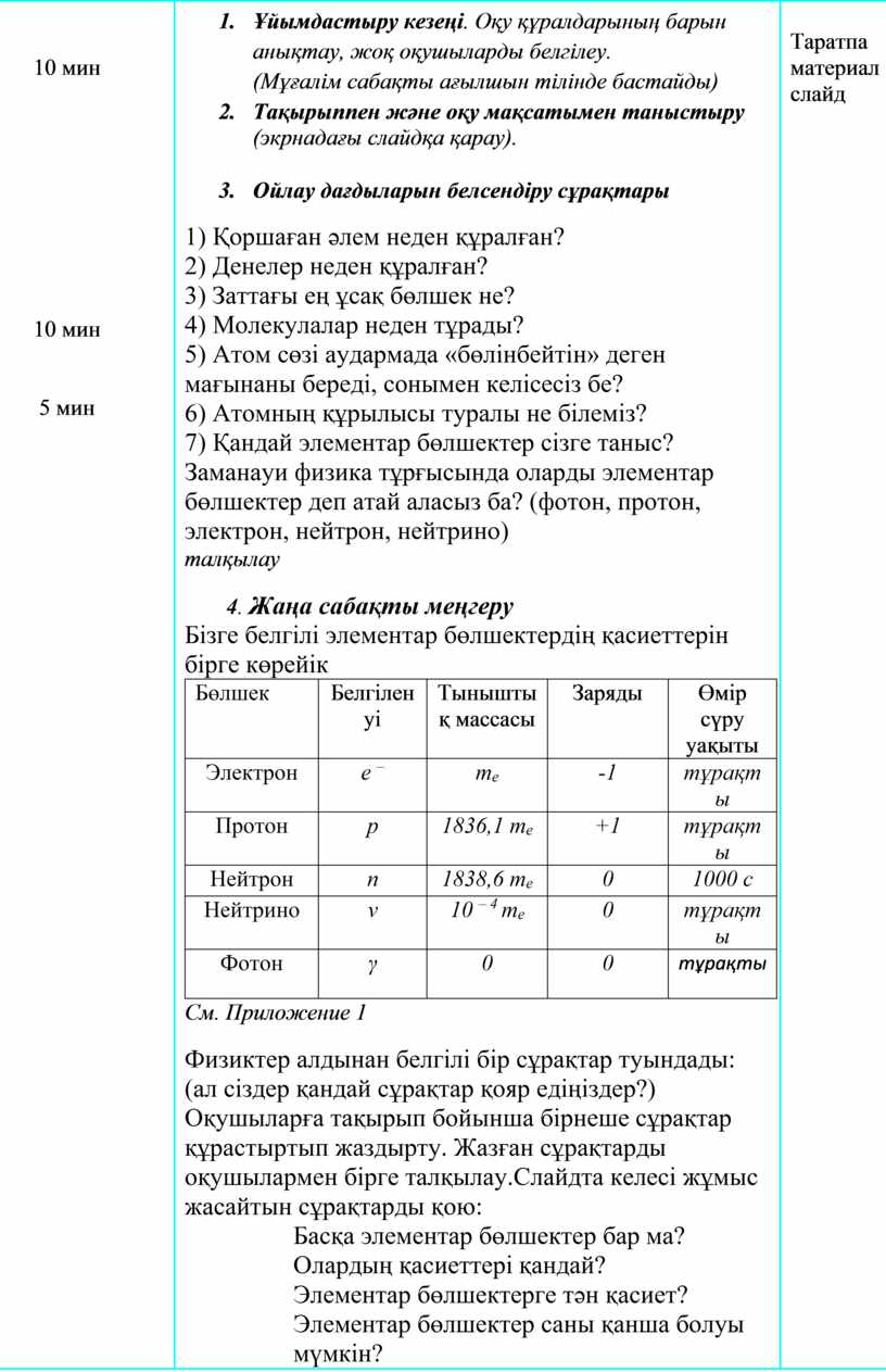 См. Приложение 1 Физиктер алдынан белгілі бір сұрақтар туындады: (ал сіздер қандай сұрақтар қояр едіңіздер?) Оқушыларға тақырып бойынша бірнеше сұрақтар құрастыртып жаздырту. Жазған сұрақтарды оқушылармен бірге талқылау.Слайдта келесі жұмыс жасайтын сұрақтарды қою: Басқа элементар бөлшектер бар ма? Олардың қасиеттері қандай? Элементар бөлшектерге тән қасиет? Элементар бөлшектер саны қанша болуы мүмкін? Жаңалары ашылады деп ойлайсыз ба?
